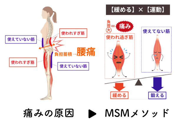 MSMメソッドとは、「M:緩める × S:鍛える × M:動きを変える」ことで、痛みの原因から改善していく施術法です。